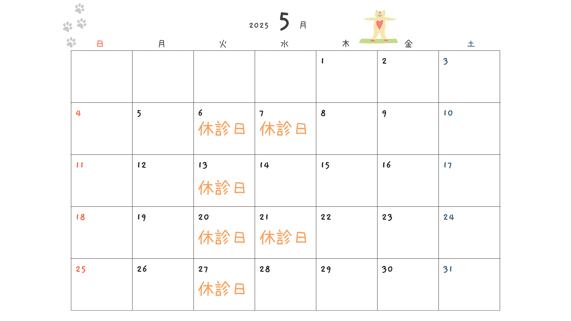 5月の休診日お知らせ 休診のお知らせ 2025.04.28 2026年1月 月 火 水 木 金 土 日 1234 567891011 12131415161718 19202122232425 262728293031 « 12月 毎週土曜 午前診療 金曜午後15時から18時 柔道外部指導の為、院長不在にしております。5/11日は柔道大会の救護活動の為、15時から16時まで、院長不在になります。ご承知おきくださいますようお願いします。