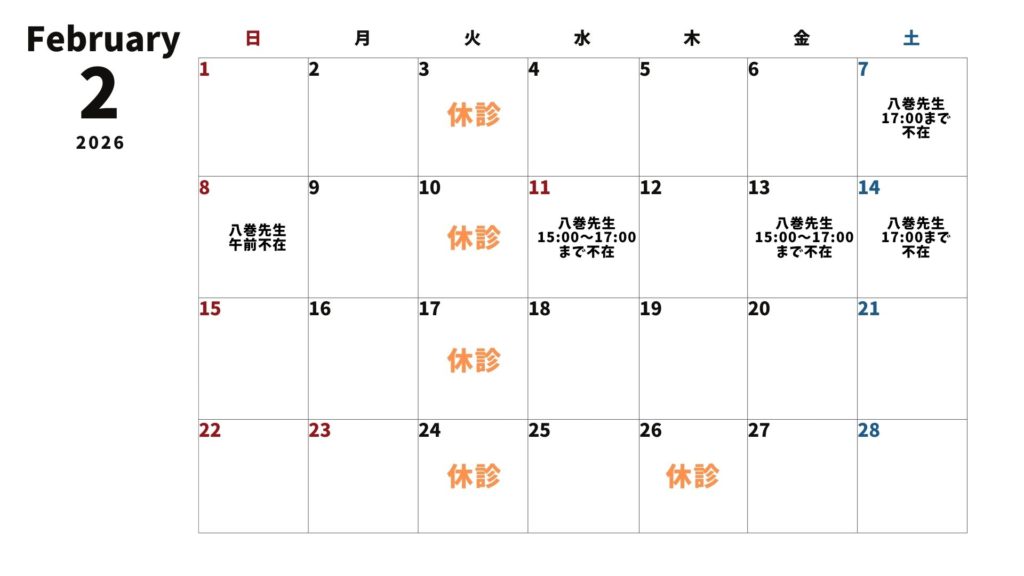 2月の診療案内です。休診日と院長不在の時間帯があります。