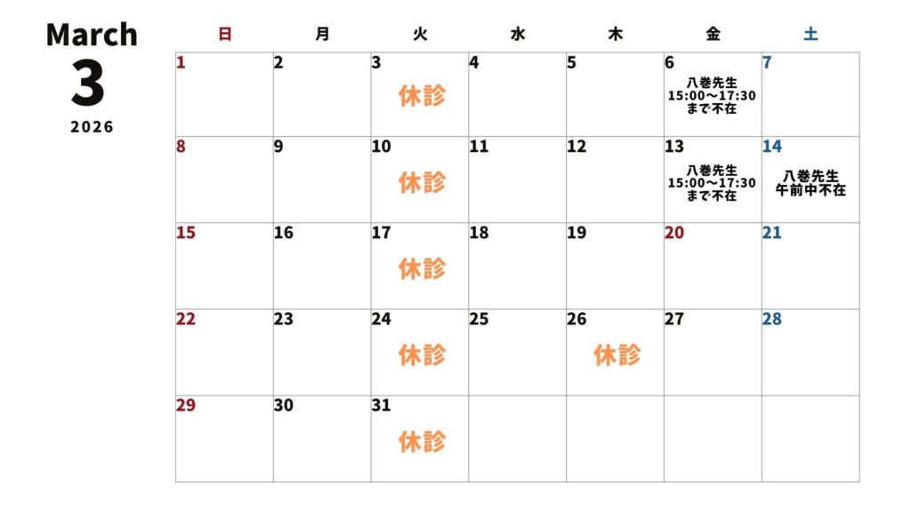 2026年3月の休診日・担当不在